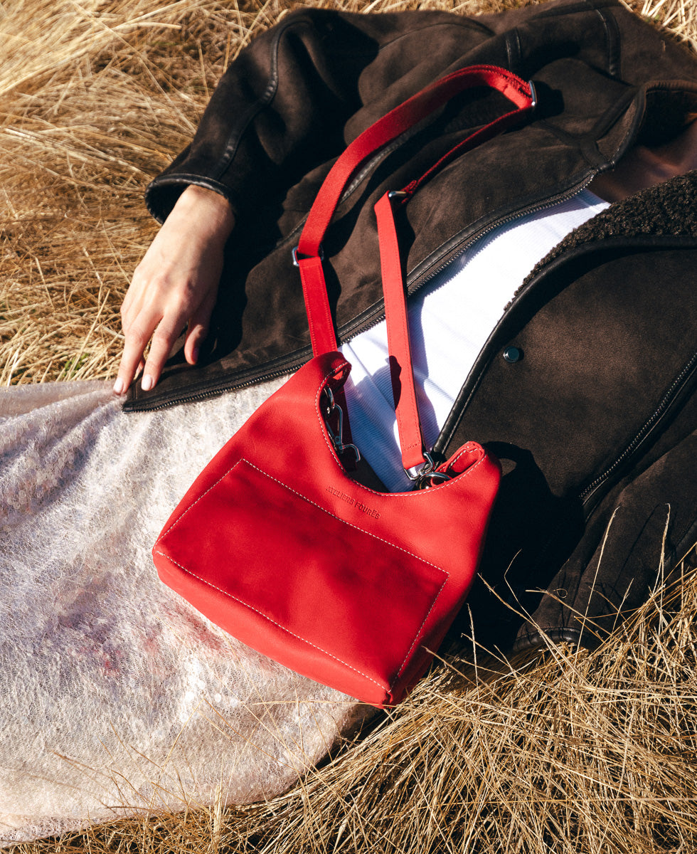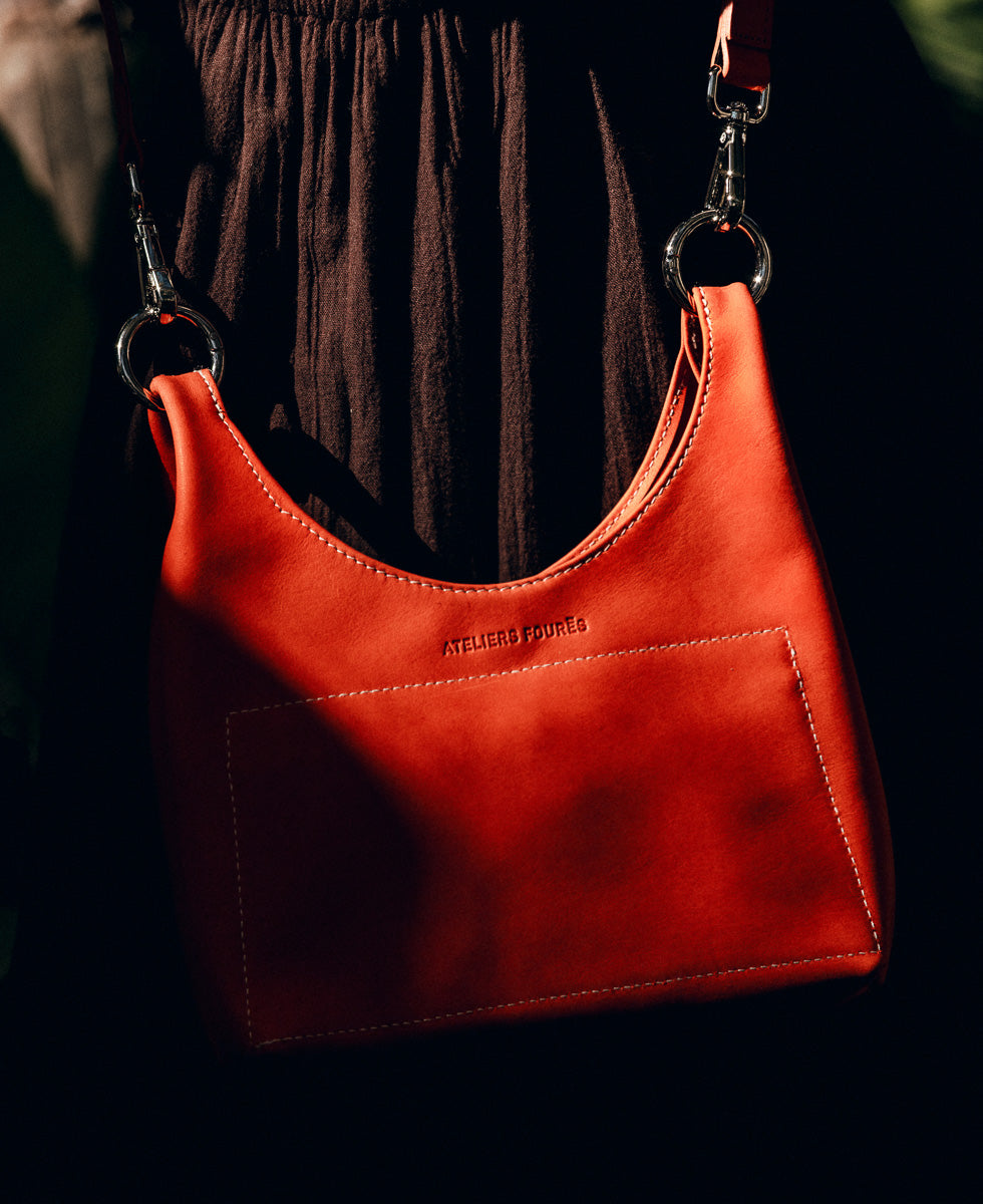 - Bandoulière bi-matière cuir et tissu (réglable et amovible)